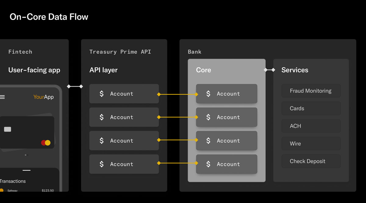 In an on-core setup, users interact with their accounts through the user-facing app you have built. The app connects to a banking API layer, which interfaces directly with the bank’s core and, in turn, the bank’s services.