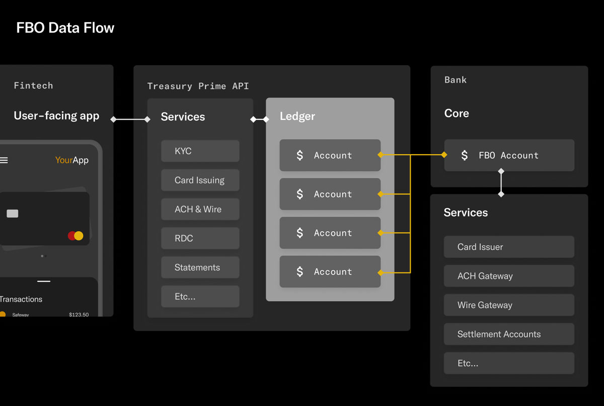 In an FBO setup, users interact with their accounts through the user-facing app you have built. The app connects to a banking API layer, which contains a ledger where records of user account activity are held. The ledger is built on top of an FBO account. That FBO account exists on the bank’s core and attaches to the bank’s services.