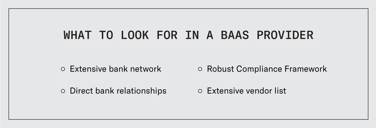 Another crucial factor to consider when choosing a BaaS provider is the ability to facilitate direct bank relationships. A direct bank relationship means that your fintech can communicate with your bank partners directly, without having to go through your BaaS provider.
